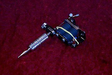 Funktion: Zwei Magnet-Spulen ziehen einen Kontaktblock an, auf der die Nadelstange mit den angelöteten Nadeln sitzt. Tritt man nun auf einen Fußschalter, so bekommen die Magnet-Spulen Stromzufuhr.Wenn der Kontaktblock durch die Magnete angezogen wurde, unterbricht die darauf befindliche Feder, die Stromzufuhr. Der Kontaktblock schnellt zurück und bekommt wiederum Strom. Dieses passiert ca.3000 mal pro Minute. Beim Linienstechen (Out -lines), mit 3 sehr feinen dünnen Nadeln bedeutet das, daß je nach eingestellter Netzteilspannung, ca. 9000 -10 000 Stiche pro Minute in die Haut eingebracht werden. Beim Ausstechen mit bis zu 14 Nadeln kann man mit ca. 50 000 - 55 000 Stichen pro Minute rechnen. Aus diesem Grund werden professionelle Tattoos auch in den Farben sehr sauber und fleckenfrei gestochen. siehe auch: Ist ein Tattoo schmerzhaft und