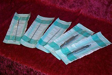 Diese werden bei jedem Kunden neu gewechselt. Das wellige Papier und der bräunliche Indikator zeigen, daß diese Nadeln und Griffstücke sterilisiert worden sind. siehe auch:
