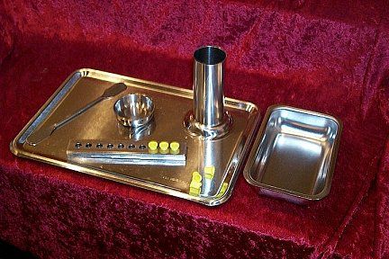 Die Dinge ( Standzylinder zum Ausspülen des Desinfektionsmittels nach den Entnehmen der Tattoo-Maschine aus dem Ultraschallreiniger, Farbkappenhalter, Creme-Schälchen, Spatel ) auf dem Tablett werden zum tätowieren benutzt und ebenfalls gewechselt. Die gelben Farbkappen werden entsorgt. siehe auch: